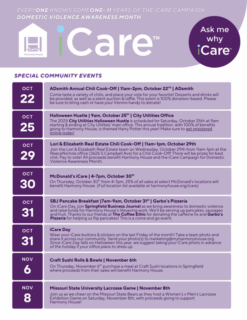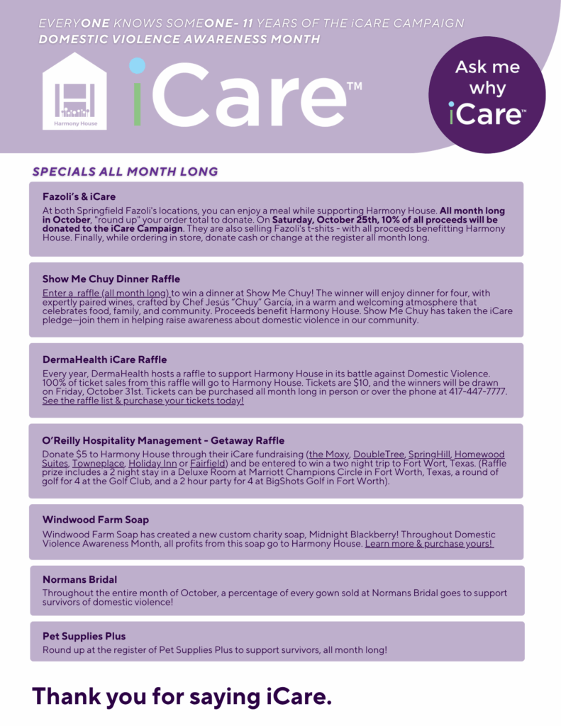 Join us around the community this iCare season! All of the events below are open to the public, held by iCare participating businesses, & are benefitting the mission of Harmony House. From raffles for dinner & skincare, to month-long restaurant proceeds, to a 5K or lacrosse game – there is something for everyone to get involved. Learn more at the link below & join us this Domestic Violence Awareness Month!