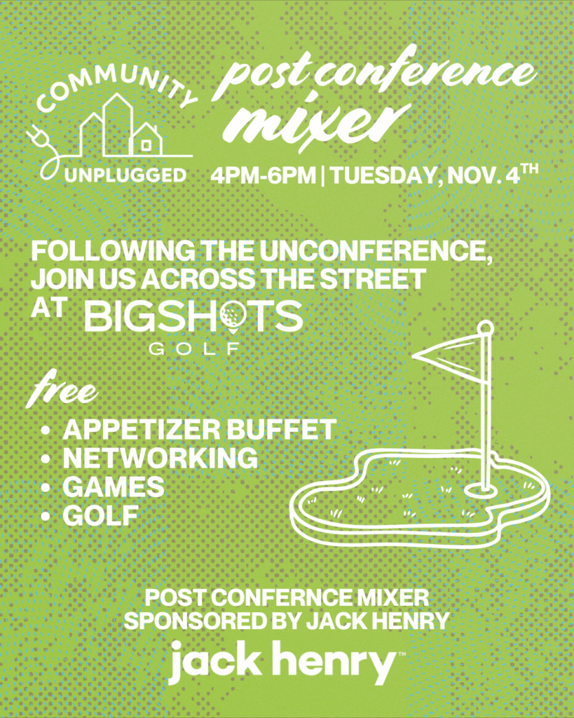 4pm-6pm: Big Shots Post Conference Mixer Presented by Jack Henry. Join us for a free appetizer buffet, networking, games & golf across the street at Big Shots!