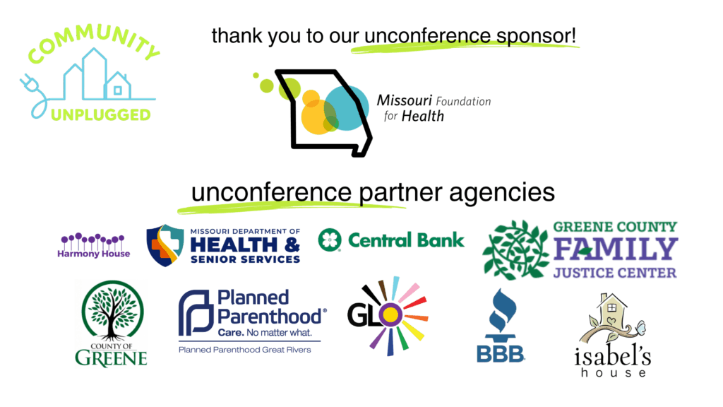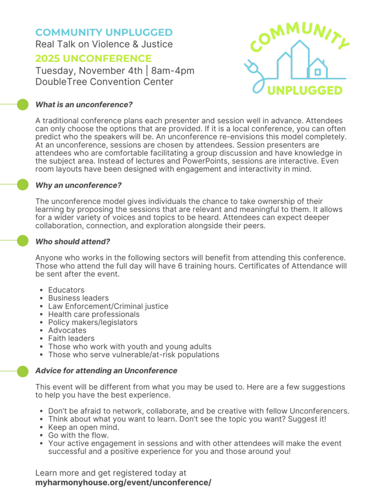 Join us for Community Unplugged: Real Talk on Violence & Justice (generously sponsored by the Missouri Foundation for Health) this November! You’re invited to our first ever unconference, a prevention education event hosted by Harmony House, in collaboration with community agency partners.