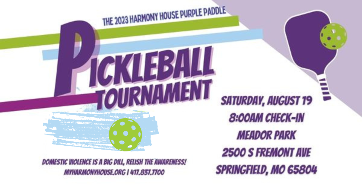 Meador Park 2500 S Fremont Ave, Springfield, MOThe first annual Purple Paddle Pickleball Tournament to benefit Harmony House. LOCATION: Meador Park - outdoors: 2500 S Fremont Ave Springfield, MO 65804 w/ 12 permanent nets. Franklin X40 balls. TIME: 08/19/2023 Tournament Date 08:00am Checkin 08:30am Play starts Mixed events by skill level start in the morning. Men's doubles and women's doubles will start […]