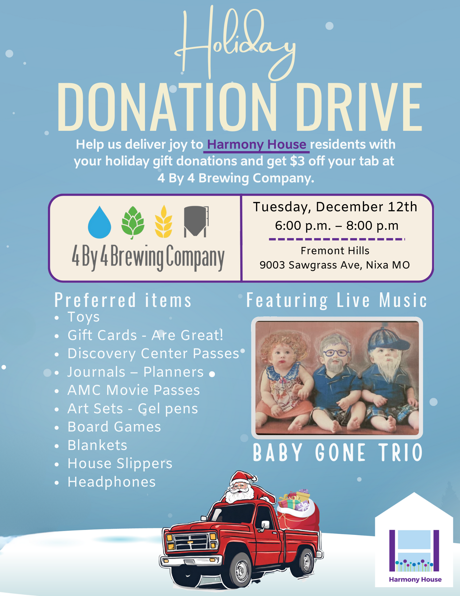 4 By 4 Brewing Company Fremont Hills 9003 Sawgrass Ave, Nixa, MO, United StatesMark your calendars for Tuesday, December 12th, from 6:00 p.m. to 8:00 p.m. to be part of a very special Holiday Gift Donation Drive supporting Harmony House, hosted by 4 By 4 Brewing Company. Bring your holiday gift donations and as a thank you, enjoy $3 off your tab. It's a perfect opportunity to come […]